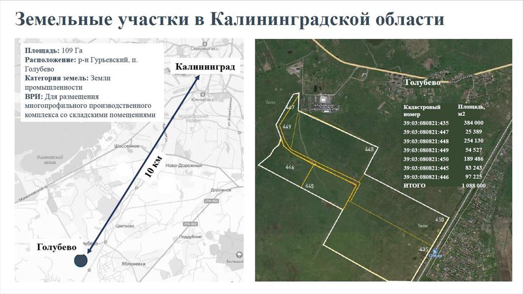 Реализуются единым лотом 7 земельных участков для размещения многопрофильного производственного комплекса со складскими помещениями. Участки смежные и свободны от каких-либо построек. Адрес: Калининградская обл. , Гурьевский р-н, п. Голубево. Общая площадь участков: 1 088 000 кв. м Категория земель: земли промышленности; Разрешенное использование: для размещения многопрофильного производственного комплекса со складскими помещениями. Форма права: собственность Коммуникации: требуют подведения. Зонирование по Генплану: производственная зона. Зонирование по ПЗЗ: П-5 зона производственных и коммунально-складских объектов, расположенных вне границ населенных пунктов. Местоположение и транспортная доступность: Земельный участок расположен в пос. Голубево у ж/д станции «1298 км». До основной дороги около 800 м. Проход и проезд к участку свободный, осуществляется по асфальтовой дороге, частично грунтовой. До исторического центра Калининграда около 10 км. Участок возможно использовать в качестве размещения на нем производственно-складского комплекса.