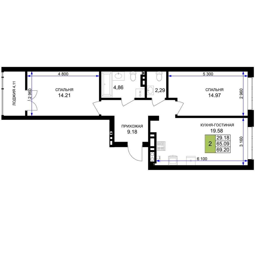 общая 69,2 м2, жилая 29,18 м2, кухни 19,58 м2 |