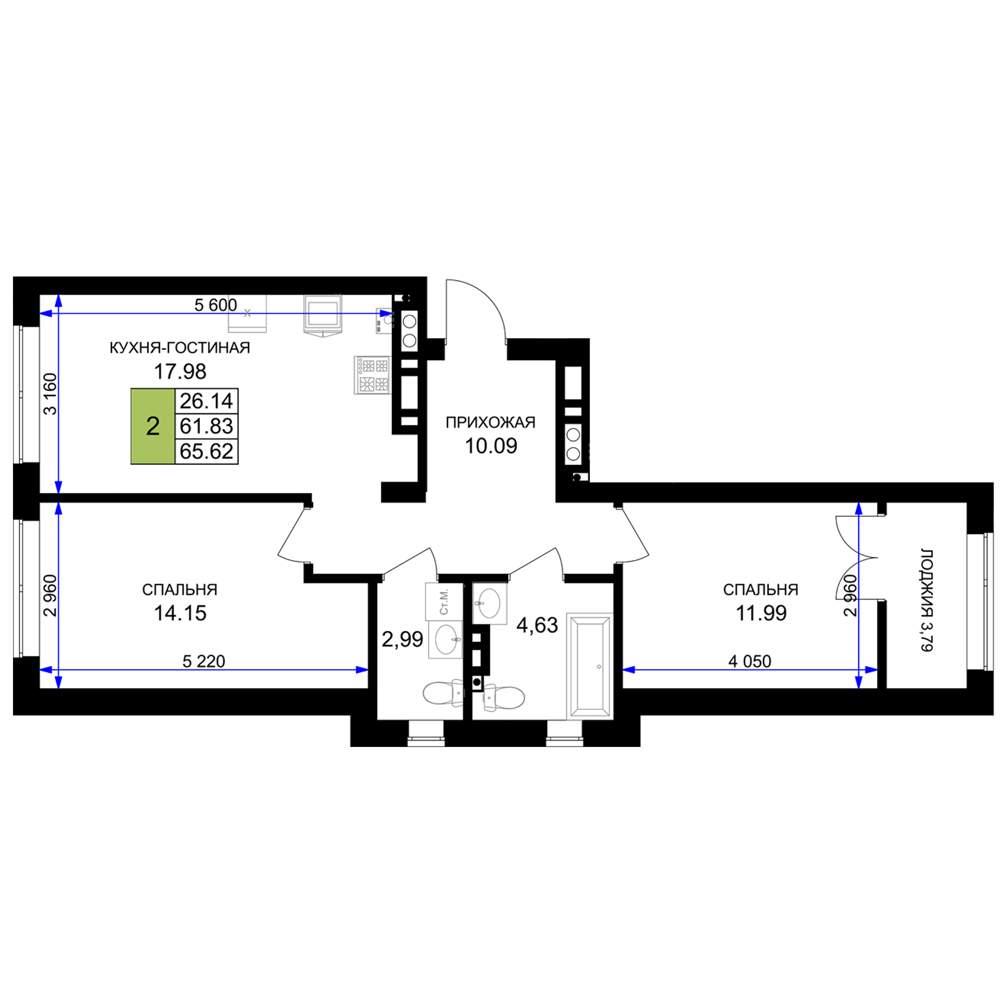 общая 65,62 м2, жилая 26,14 м2, кухни 17,98 м2 |