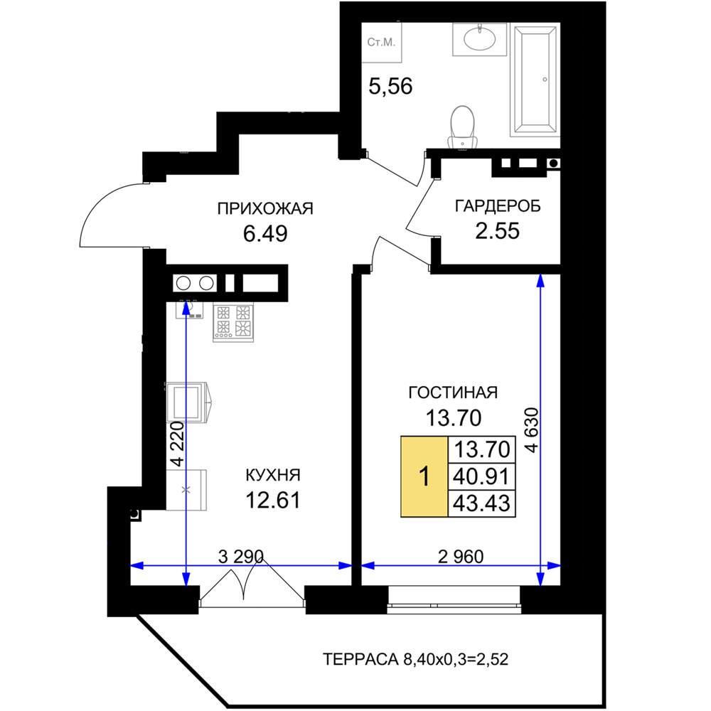 общая 43,43 м2, жилая 13,7 м2, кухни 12,61 м2 |
