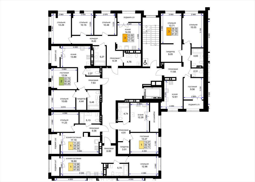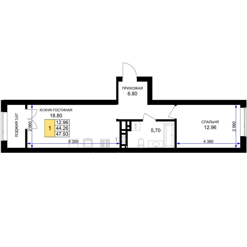 общая 47,93 м2, жилая 12,96 м2, кухни 18,8 м2 |