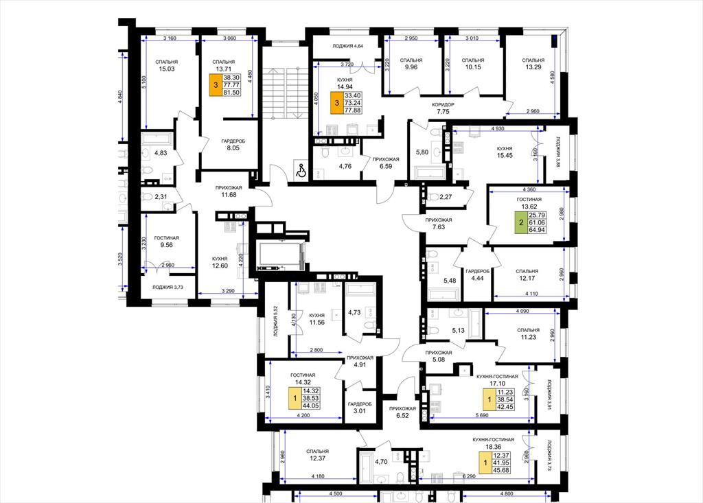 общая 81,5 м2, жилая 38,3 м2, кухни 12,6 м2 |