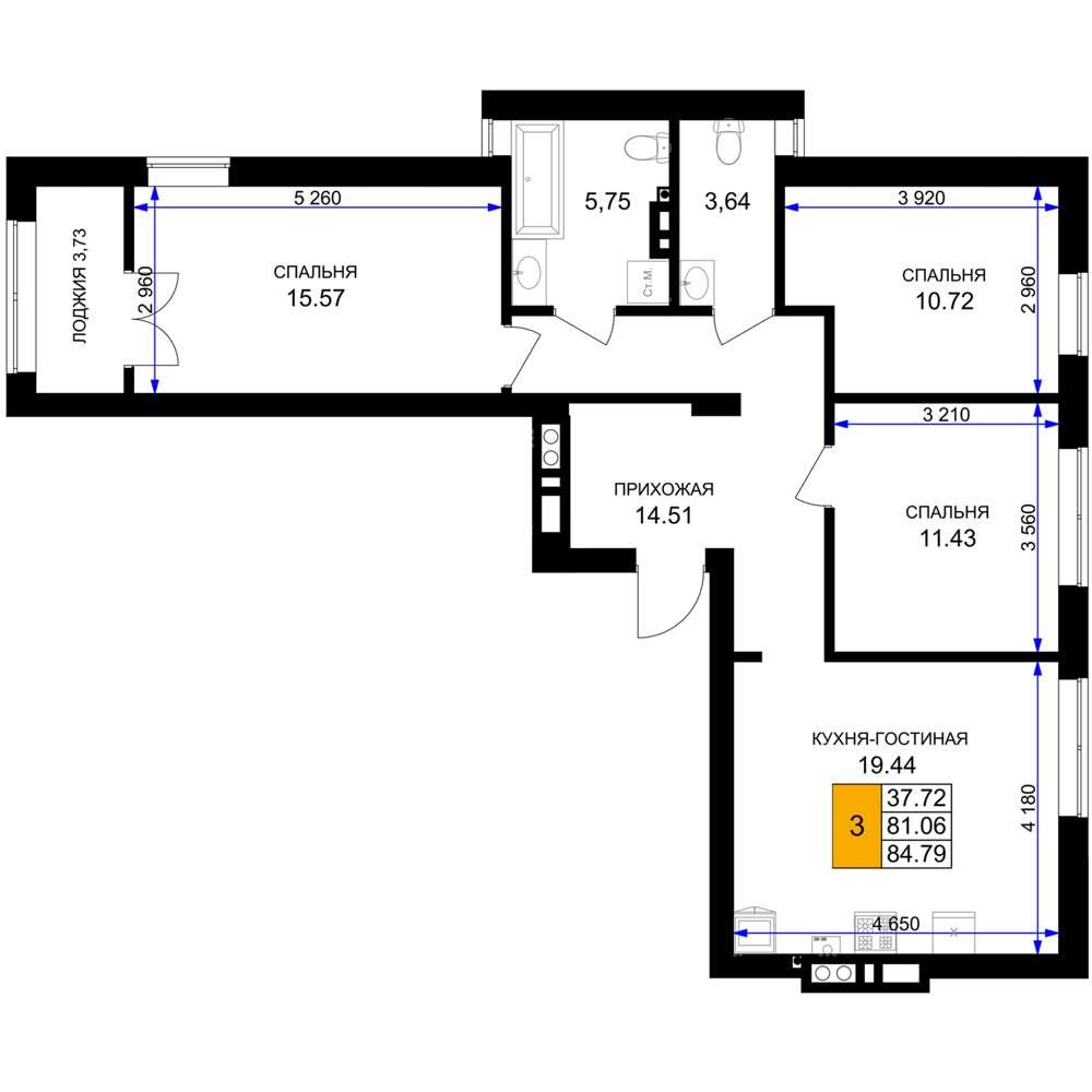общая 84,79 м2, жилая 37,72 м2, кухни 19,44 м2 |