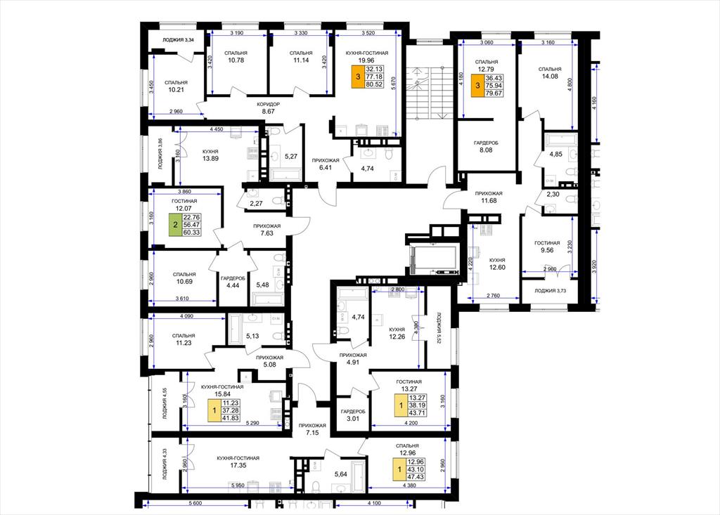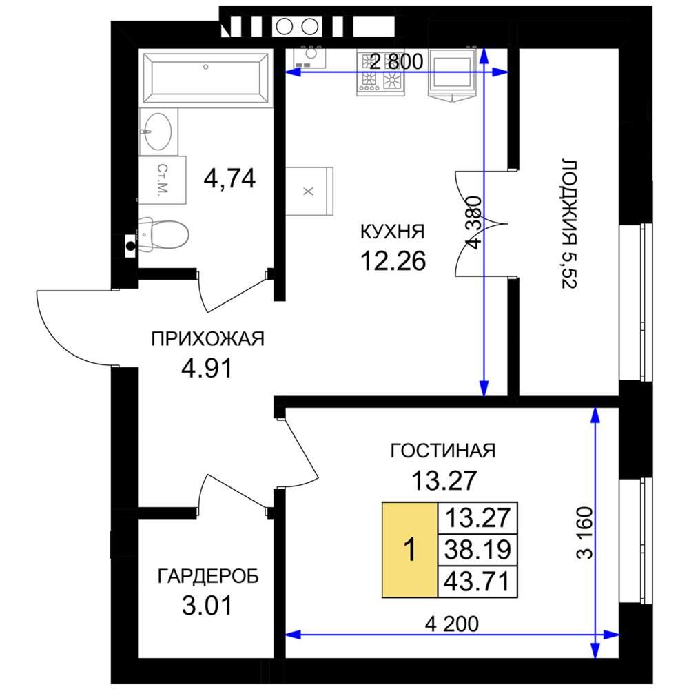 общая 43,71 м2, жилая 13,27 м2, кухни 12,26 м2 |