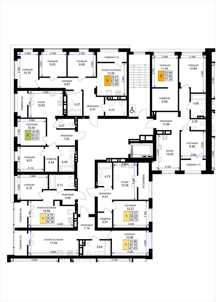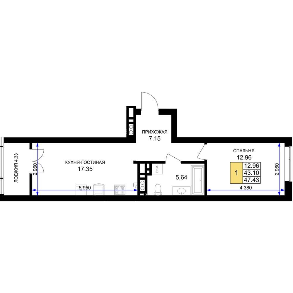 общая 47,43 м2, жилая 12,96 м2, кухни 17,35 м2 |
