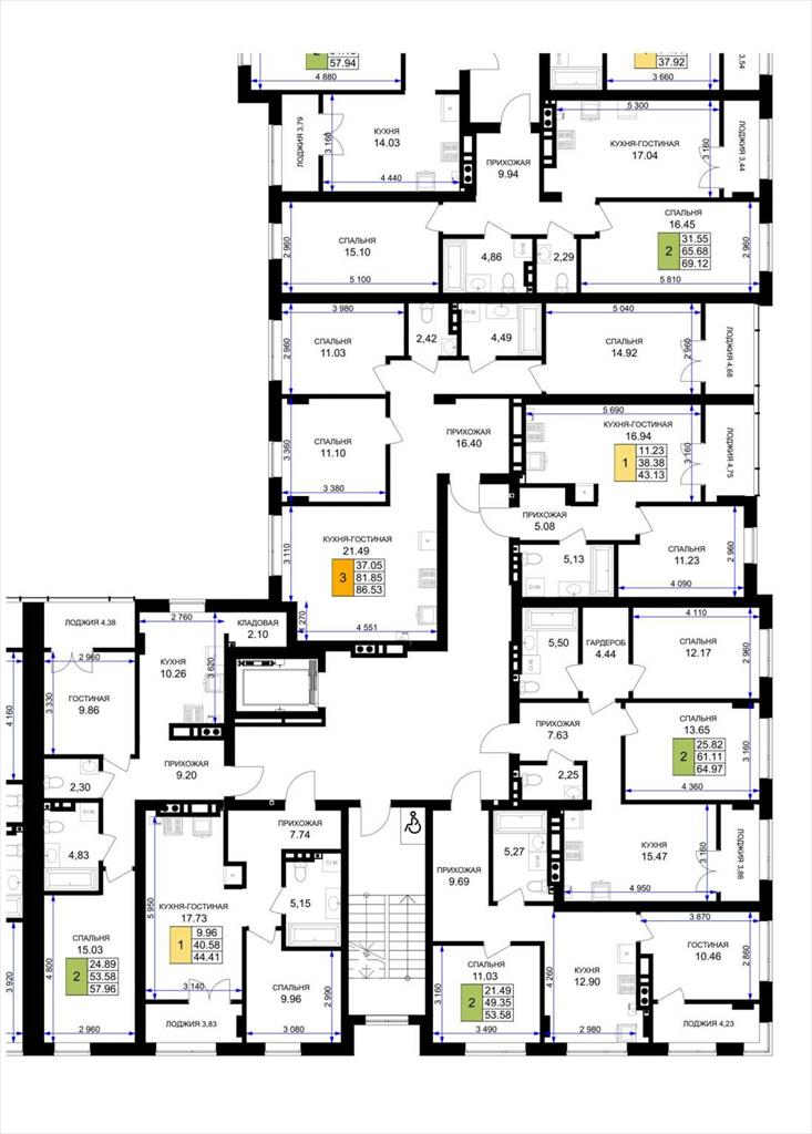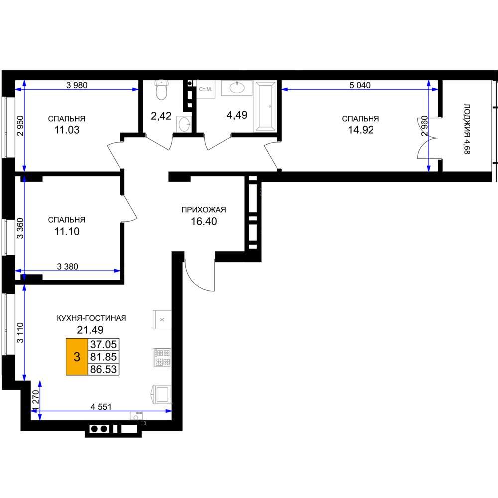 общая 86,53 м2, жилая 37,05 м2, кухни 21,49 м2 |