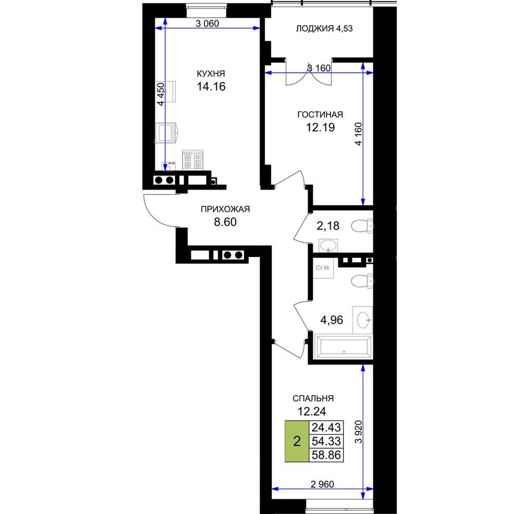 общая 58,86 м2, жилая 24,43 м2, кухни 14,16 м2 |