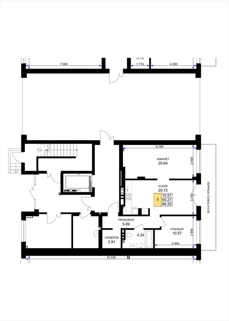 общая 69,2 м2, жилая 10,57 м2, кухни 20,72 м2 |