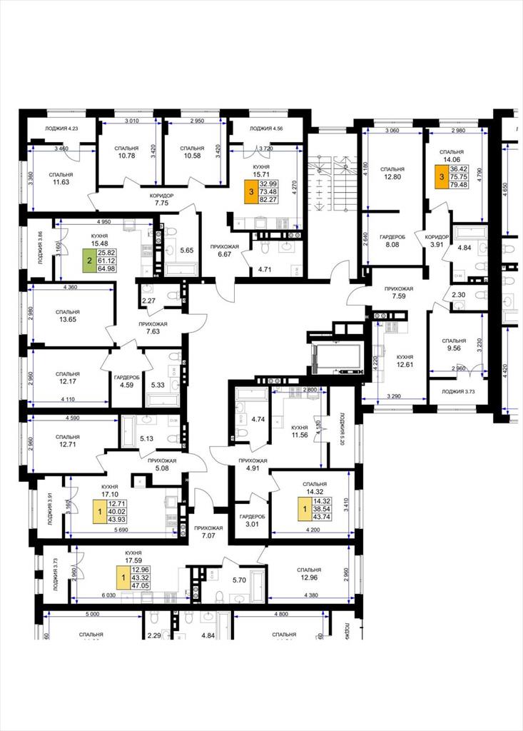 общая 79,48 м2, жилая 36,42 м2, кухни 12,61 м2 |