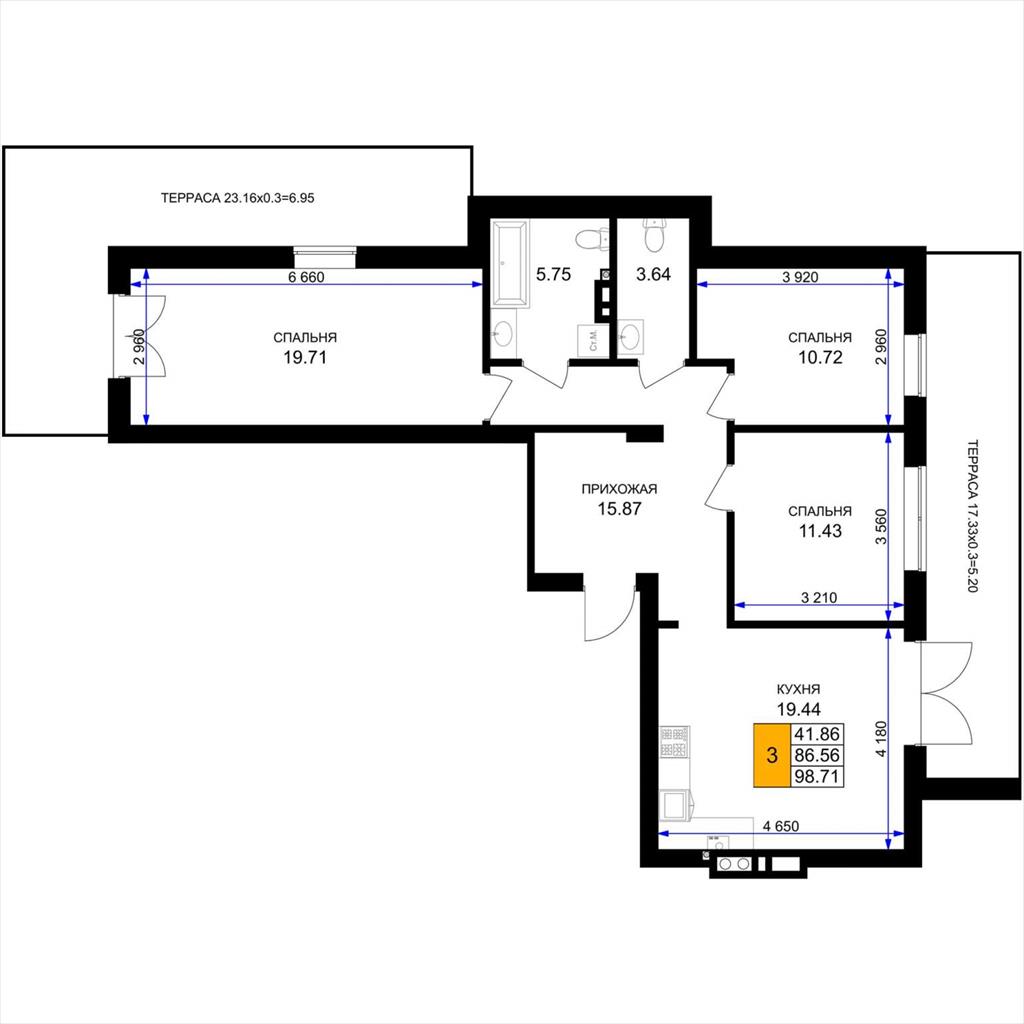 общая 98,71 м2, жилая 41,86 м2, кухни 19,44 м2 |