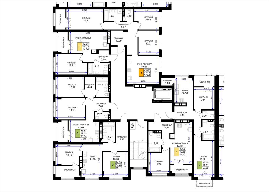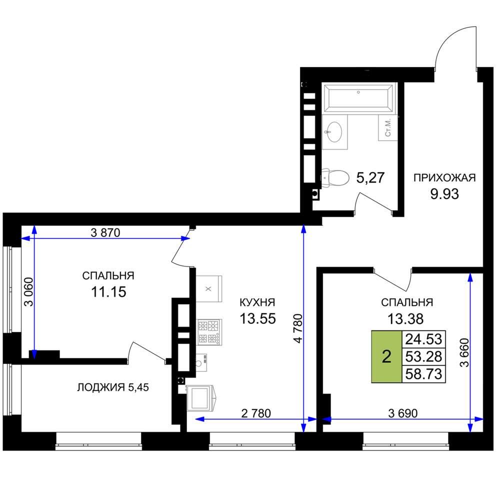 общая 58,73 м2, жилая 24,53 м2, кухни 13,55 м2 |