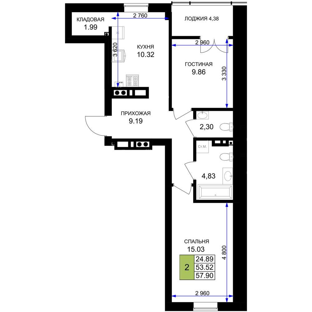 общая 57,9 м2, жилая 24,89 м2, кухни 10,32 м2 |