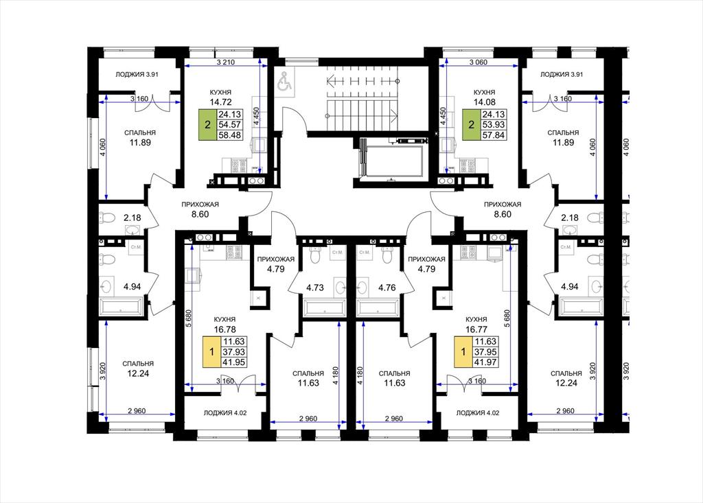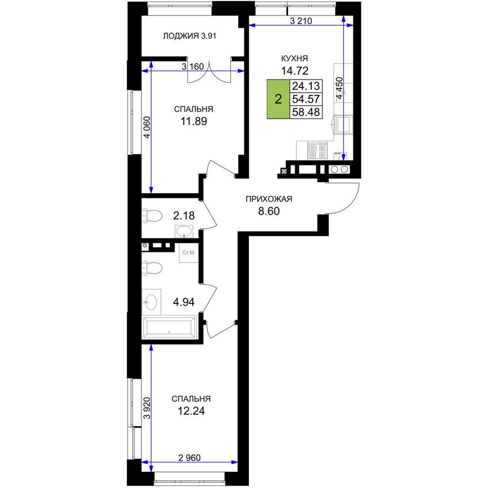 общая 58,48 м2, жилая 24,13 м2, кухни 14,72 м2 |