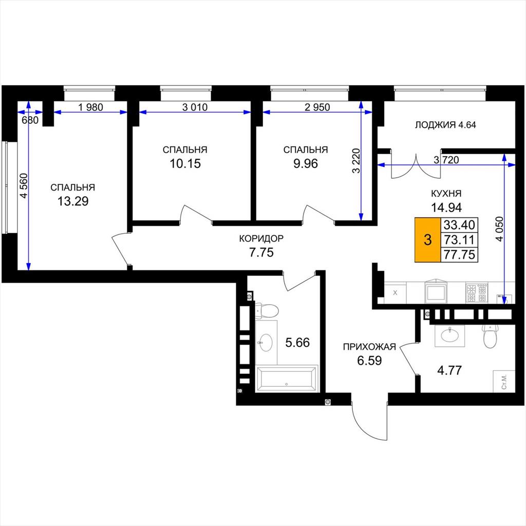 общая 77,75 м2, жилая 33,4 м2, кухни 14,94 м2 |