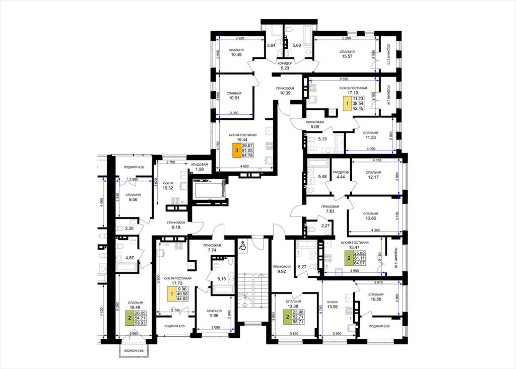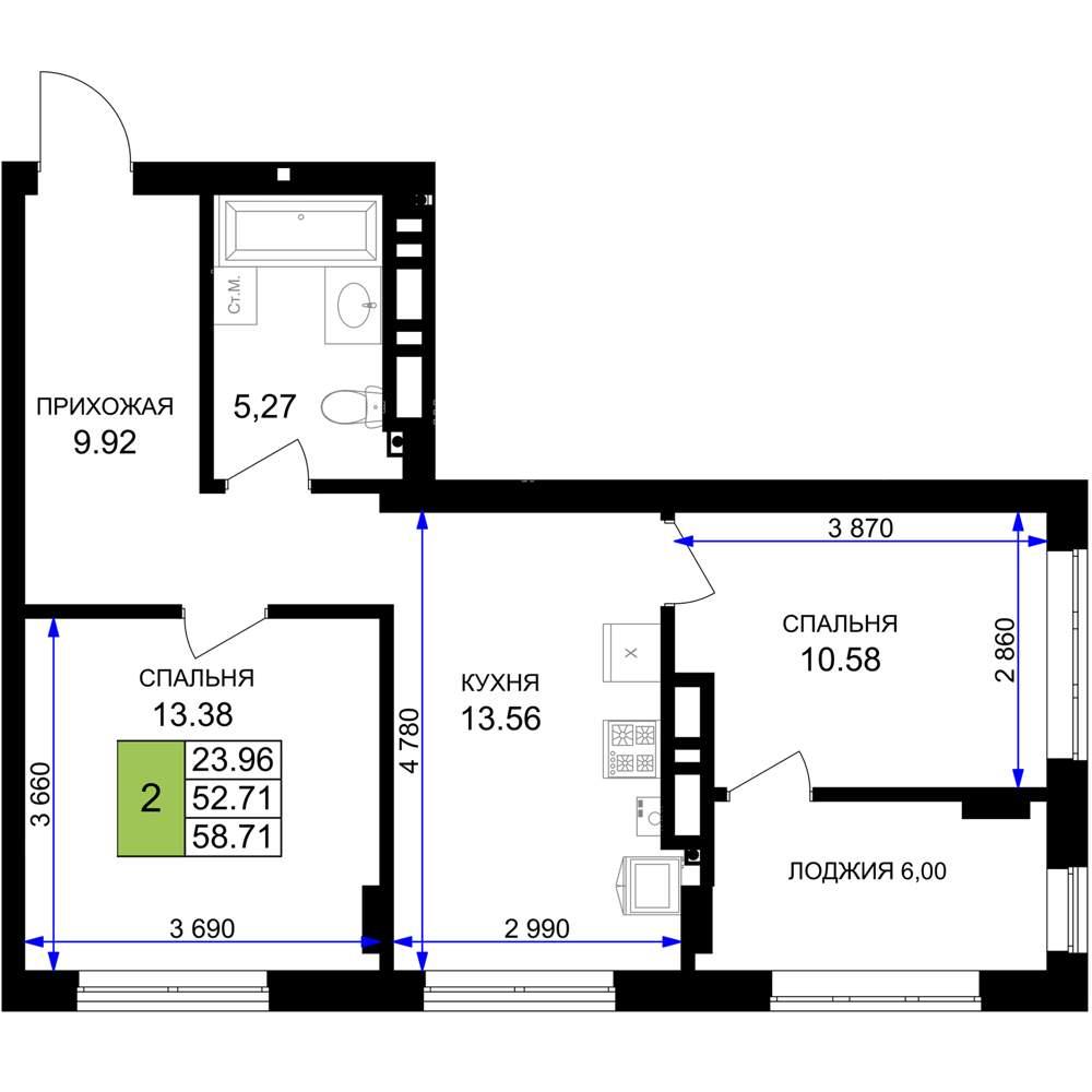 общая 58,71 м2, жилая 23,96 м2, кухни 13,56 м2 |
