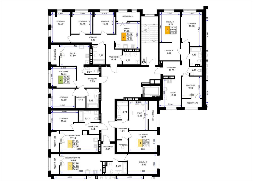 общая 47,93 м2, жилая 12,96 м2, кухни 18,8 м2 |