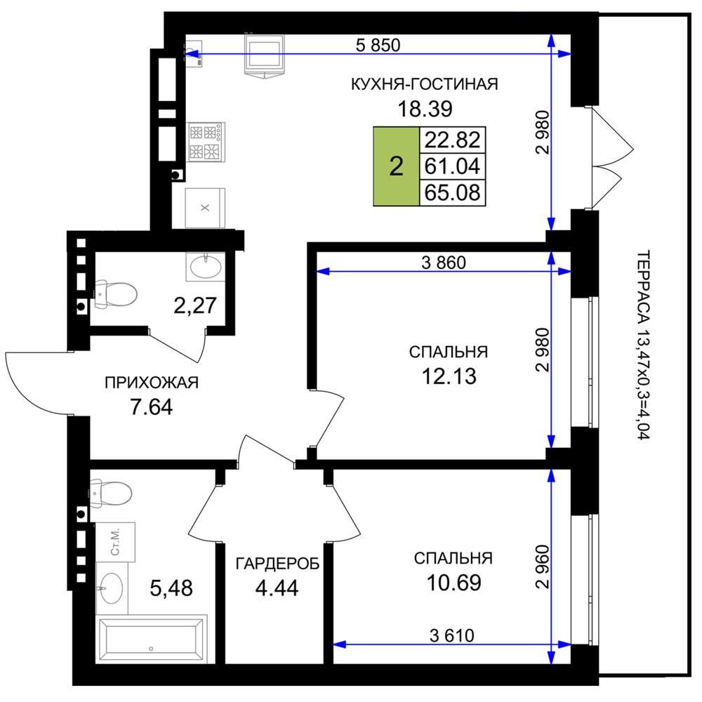общая 65,08 м2, жилая 22,82 м2, кухни 18,39 м2 |