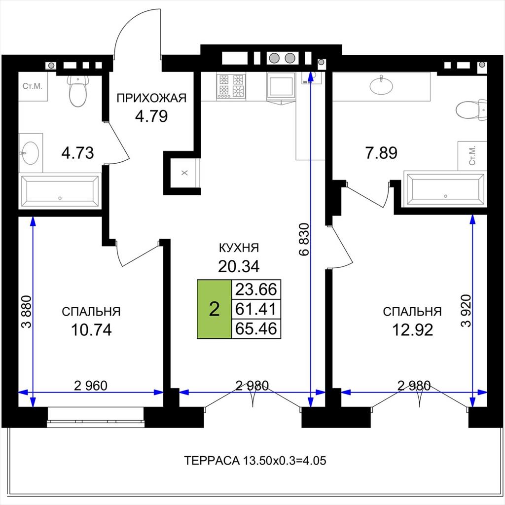 общая 65,46 м2, жилая 23,66 м2, кухни 20,34 м2 |