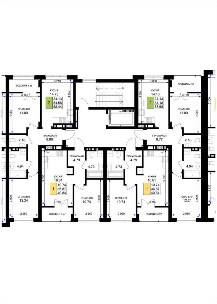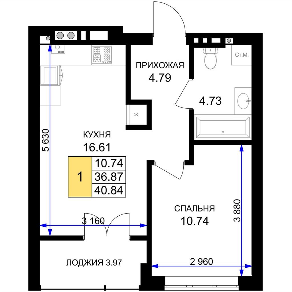 общая 40,84 м2, жилая 10,74 м2, кухни 16,61 м2 |