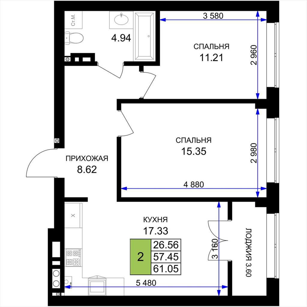 общая 61,05 м2, жилая 26,56 м2, кухни 17,33 м2 |