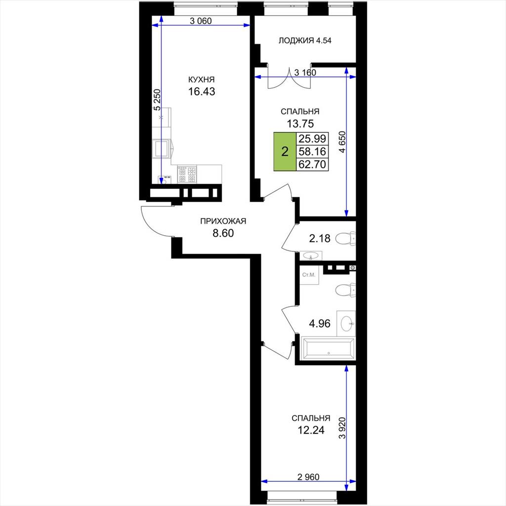 общая 62,7 м2, жилая 25,99 м2, кухни 16,43 м2 |