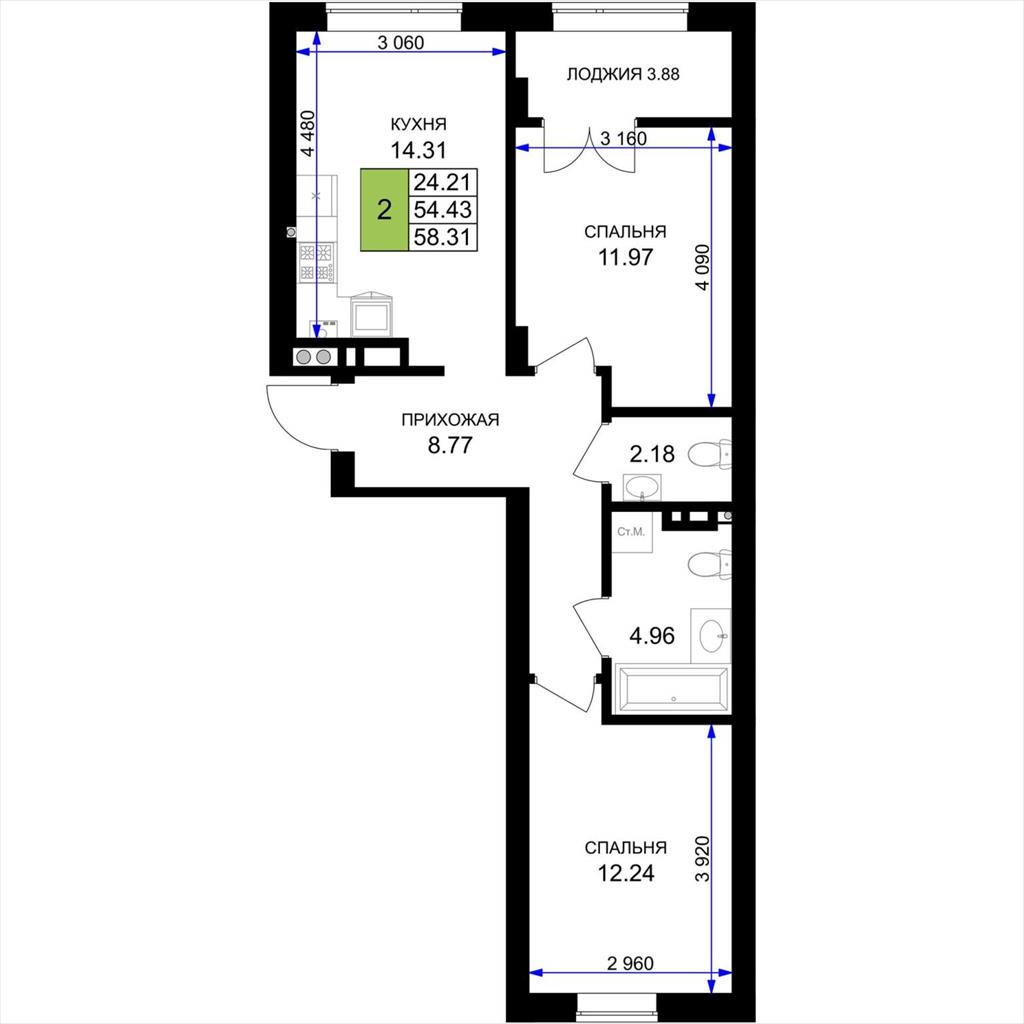 общая 58,31 м2, жилая 24,21 м2, кухни 14,31 м2 |