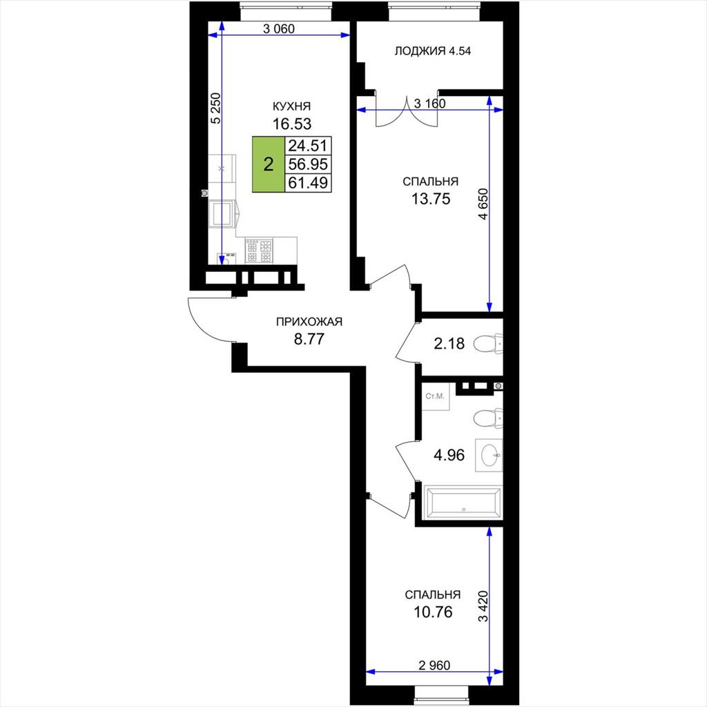 общая 61,49 м2, жилая 24,51 м2, кухни 16,53 м2 |