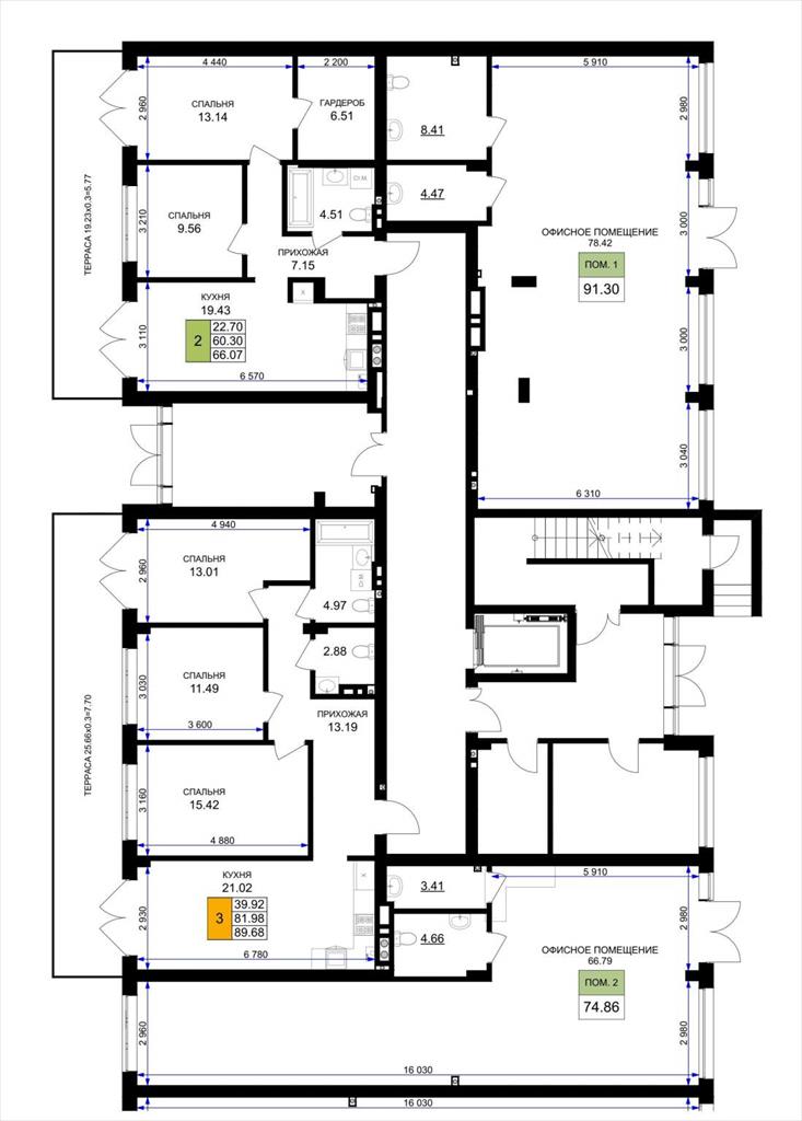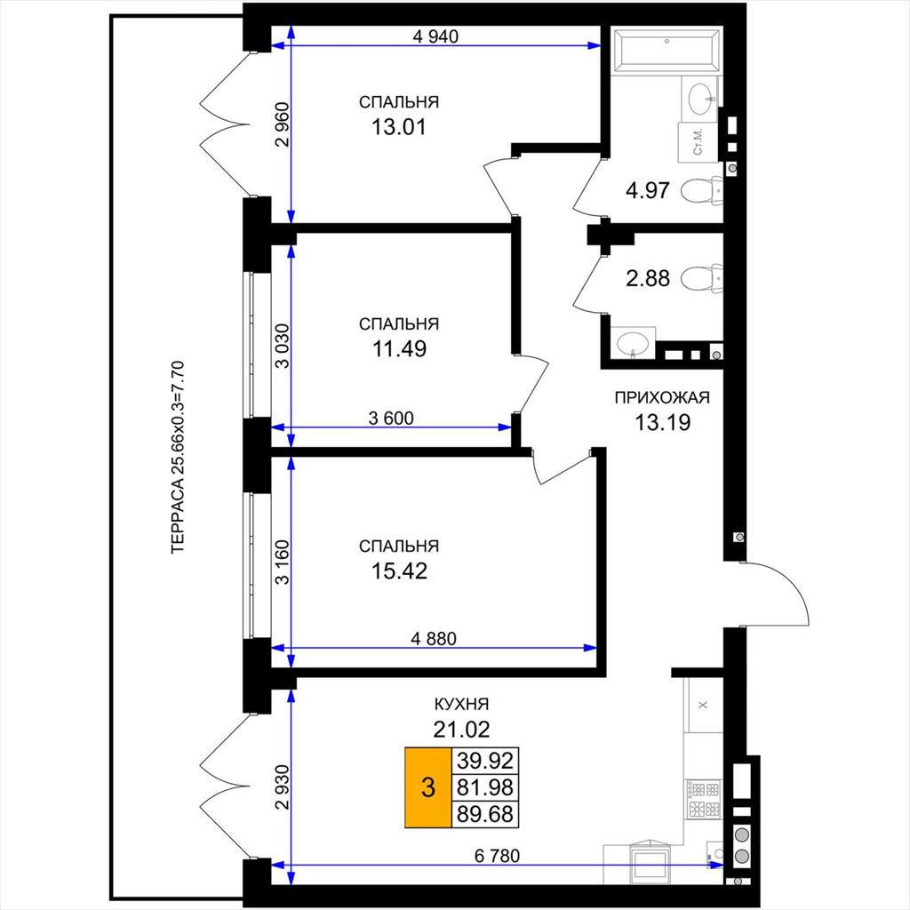 общая 89,68 м2, жилая 39,92 м2, кухни 21,02 м2 |