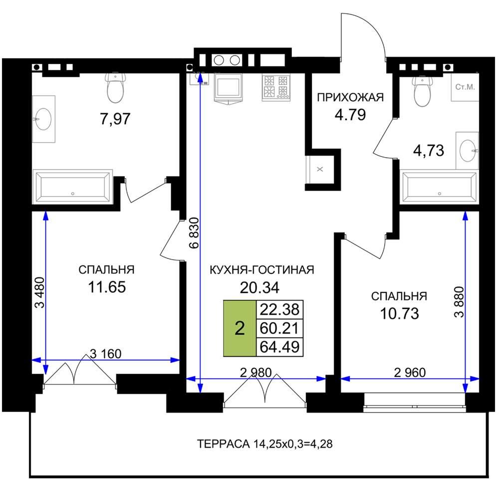 общая 64,49 м2, жилая 22,38 м2, кухни 20,34 м2 |