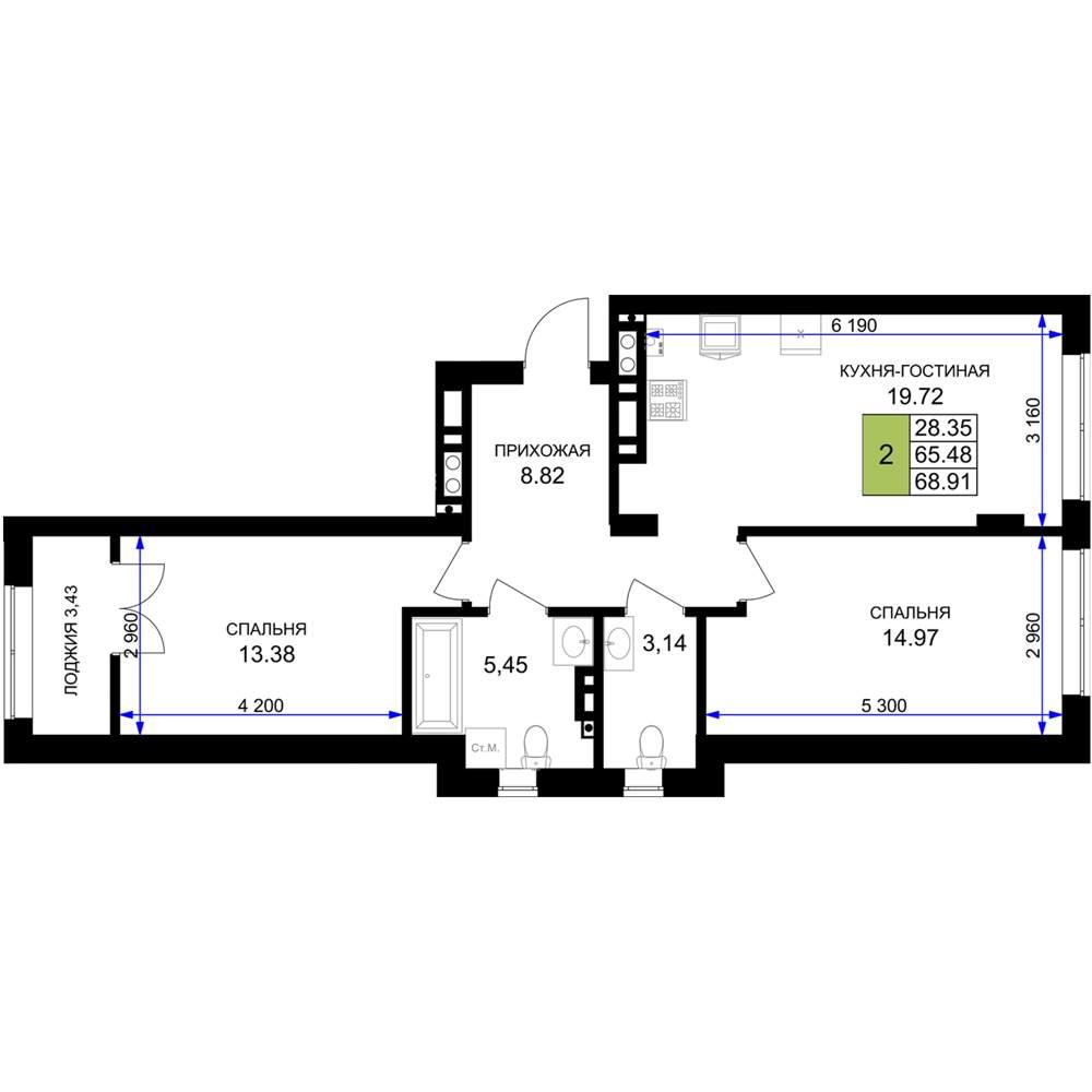 общая 68,91 м2, жилая 28,35 м2, кухни 19,72 м2 |