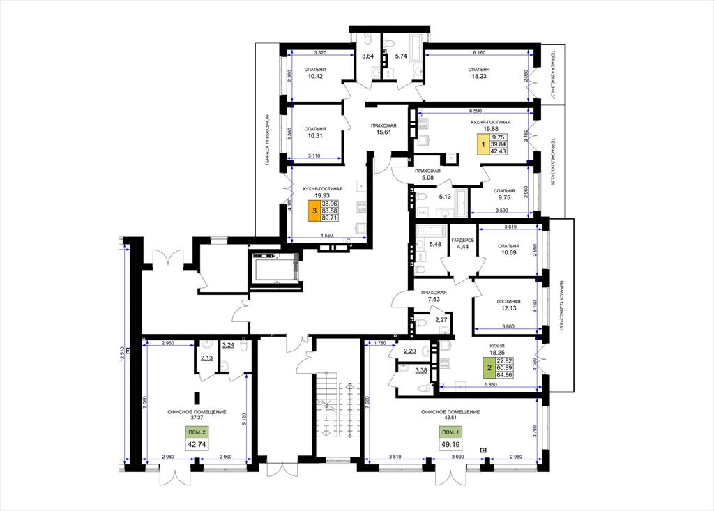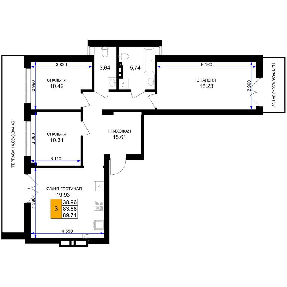 общая 89,71 м2, жилая 38,96 м2, кухни 19,93 м2 |
