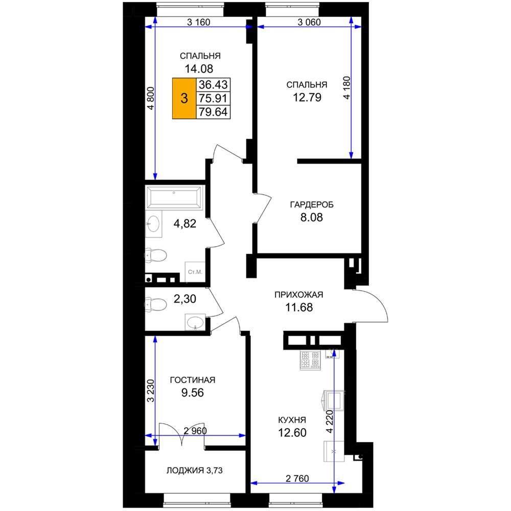общая 79,64 м2, жилая 36,43 м2, кухни 12,6 м2 |