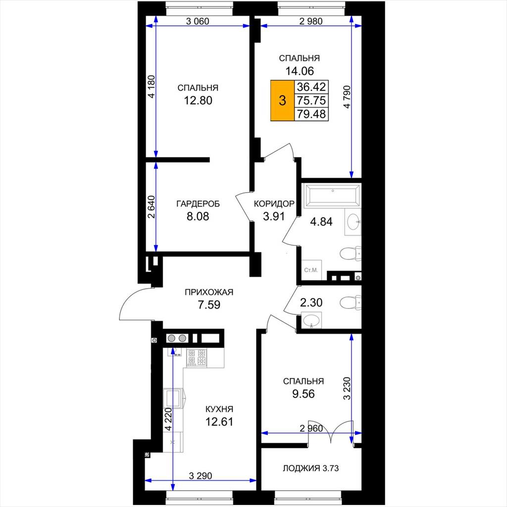 общая 79,48 м2, жилая 36,42 м2, кухни 12,61 м2 |
