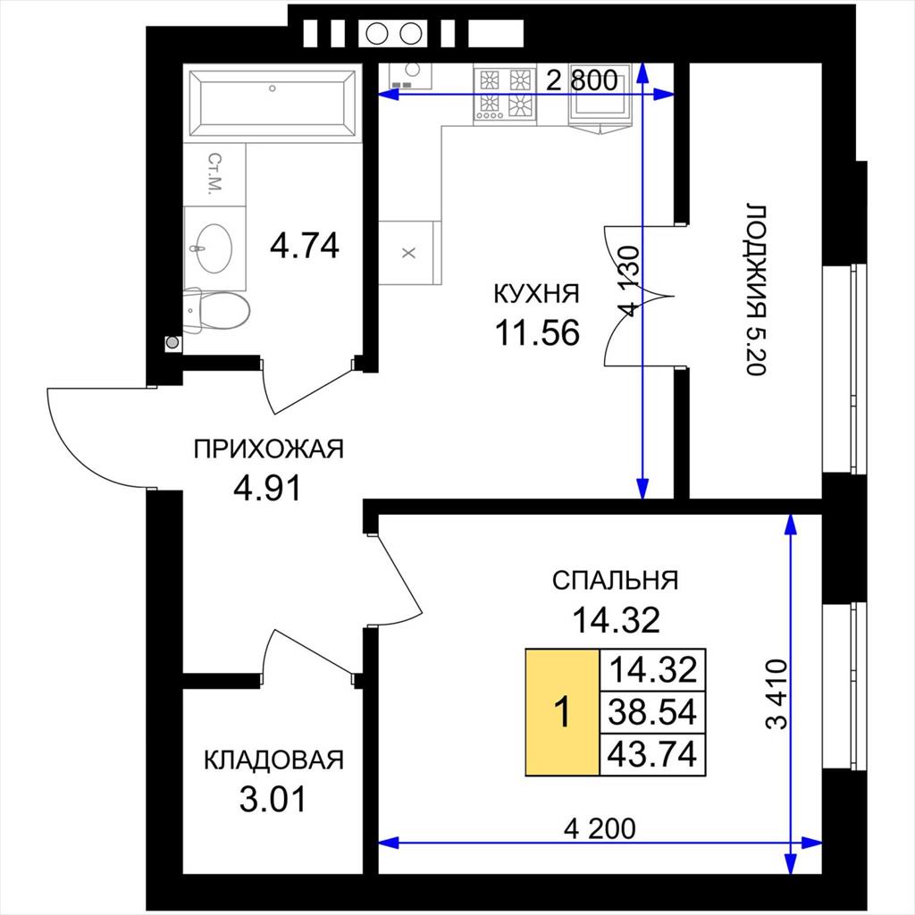 общая 43,74 м2, жилая 14,32 м2, кухни 11,56 м2 |