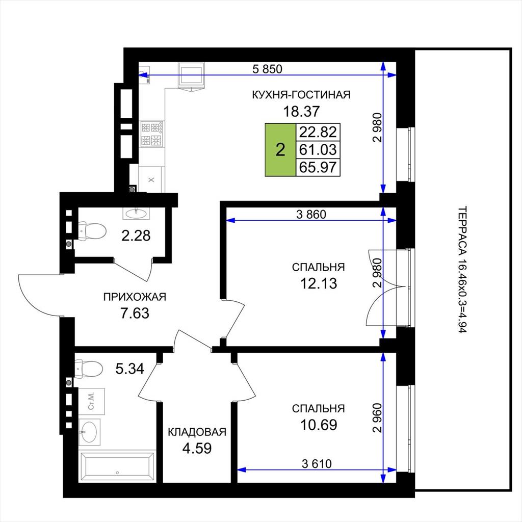 общая 65,97 м2, жилая 22,82 м2, кухни 18,37 м2 |
