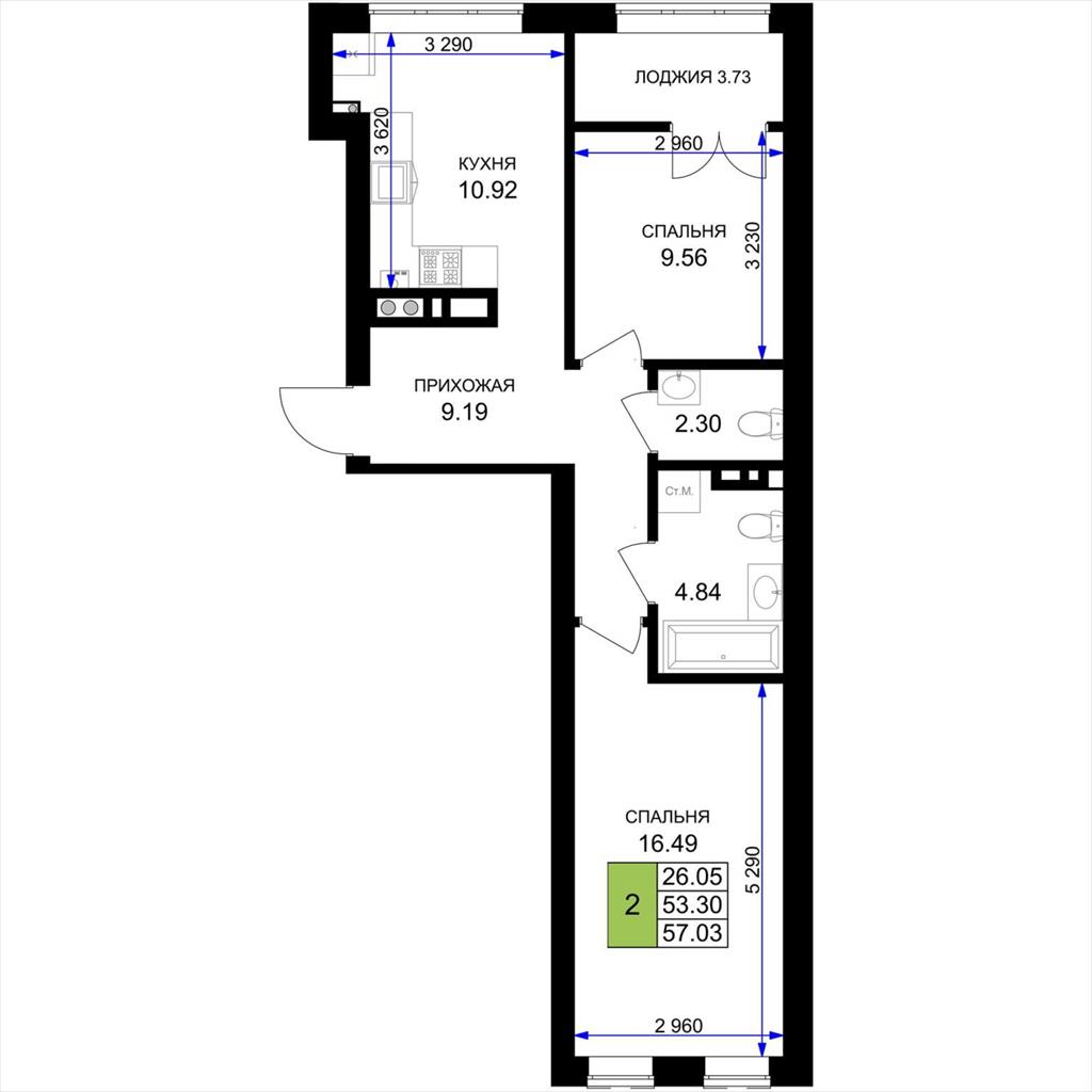 общая 57,03 м2, жилая 26,05 м2, кухни 10,92 м2 |
