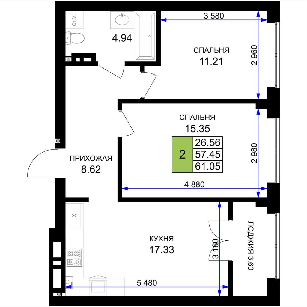 общая 61,05 м2, жилая 26,56 м2, кухни 17,33 м2 |