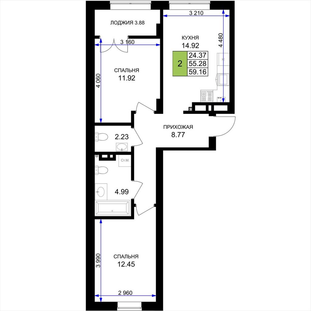 общая 59,16 м2, жилая 24,37 м2, кухни 14,92 м2 |