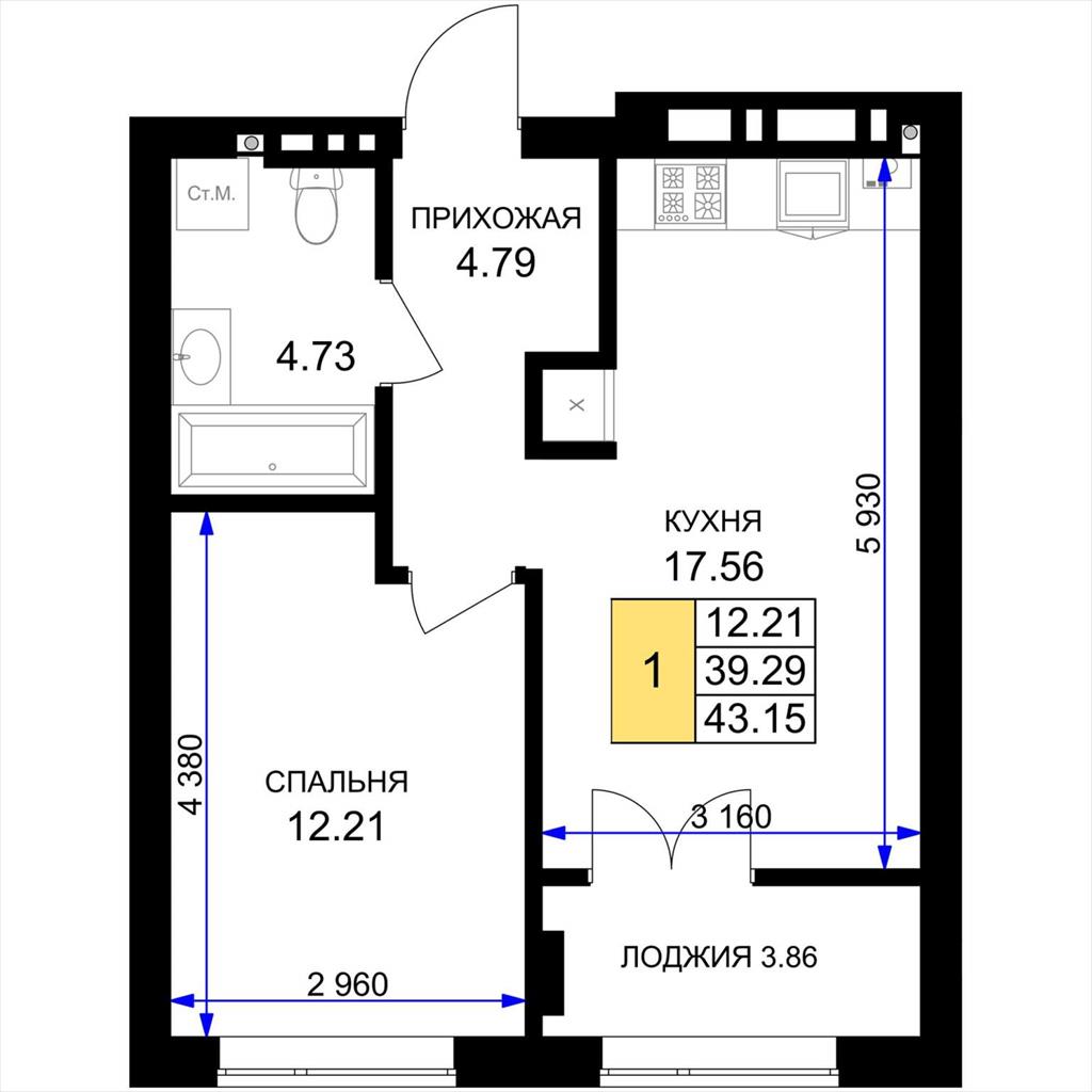 общая 43,15 м2, жилая 12,21 м2, кухни 17,56 м2 |