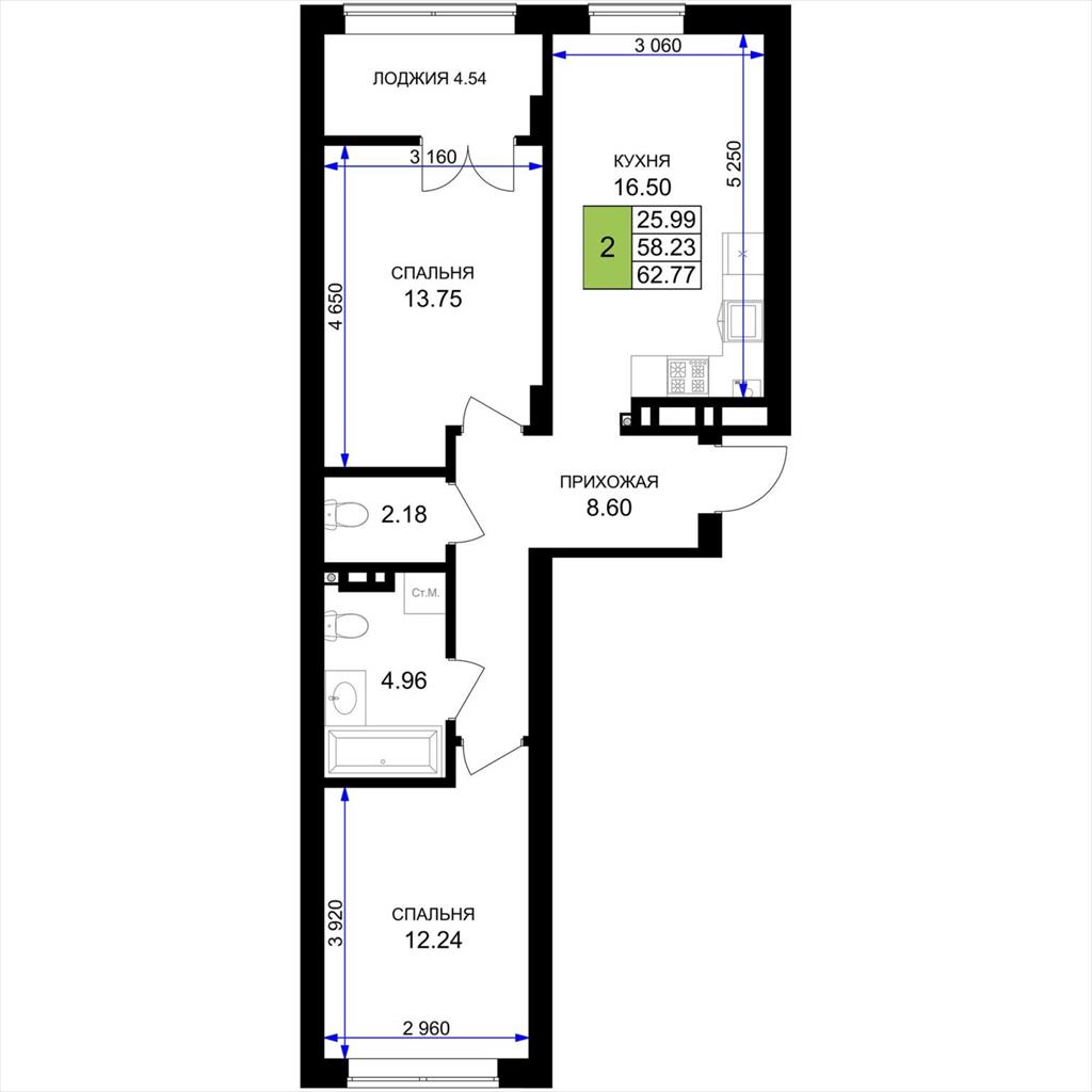 общая 62,77 м2, жилая 25,99 м2, кухни 16,5 м2 |