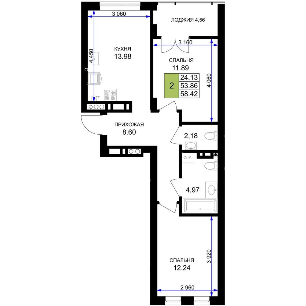 общая 58,42 м2, жилая 24,13 м2, кухни 13,98 м2 |
