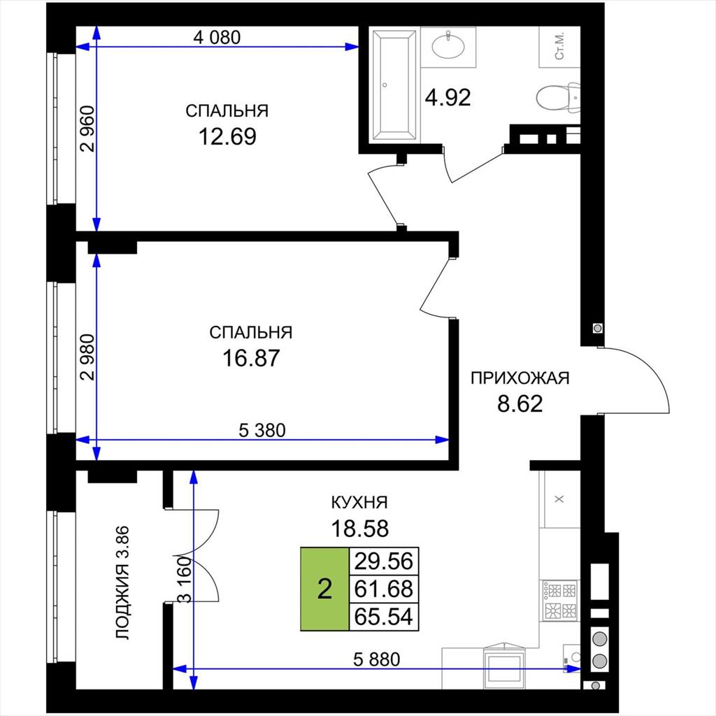 общая 65,54 м2, жилая 29,56 м2, кухни 18,58 м2 |