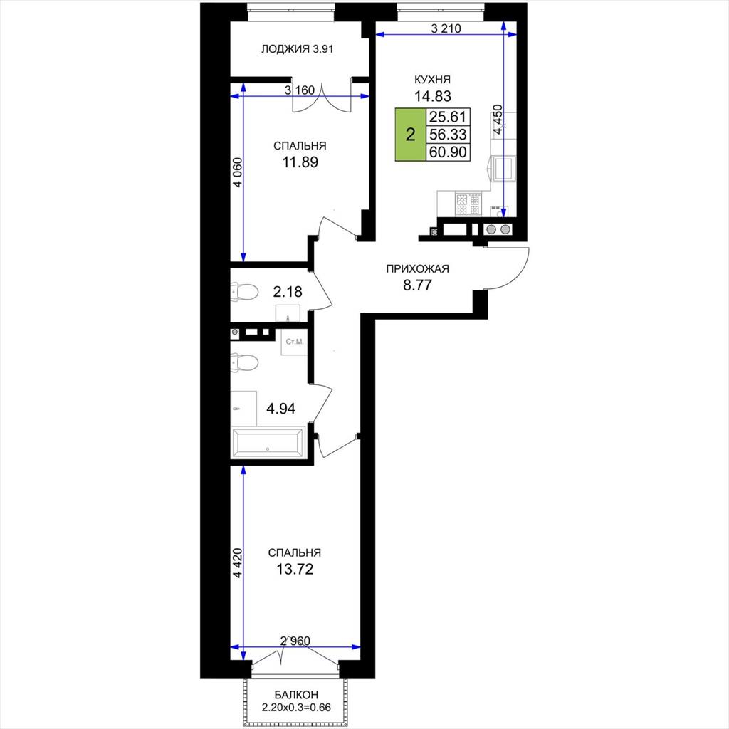 общая 60,9 м2, жилая 25,61 м2, кухни 14,83 м2 |
