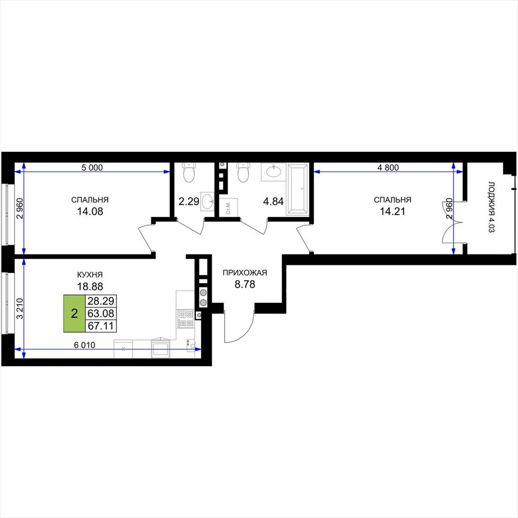 общая 67,11 м2, жилая 28,29 м2, кухни 18,88 м2 |