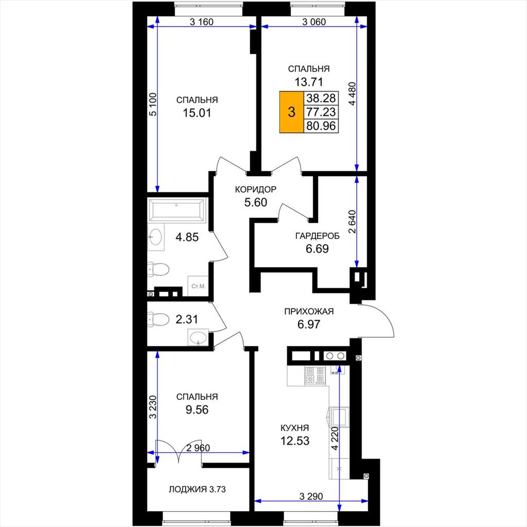общая 80,96 м2, жилая 38,28 м2, кухни 12,53 м2 |