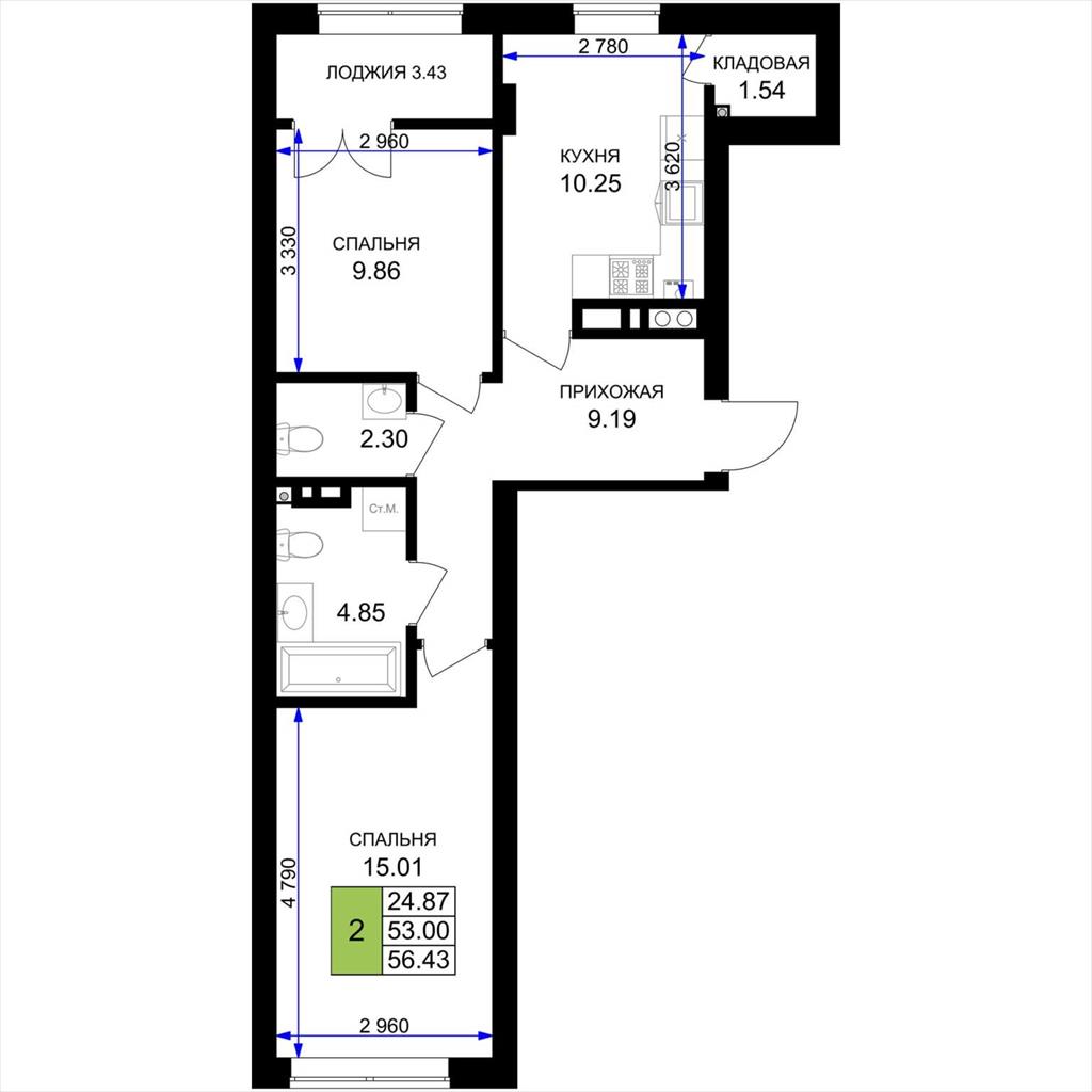 общая 56,43 м2, жилая 24,87 м2, кухни 10,25 м2 |