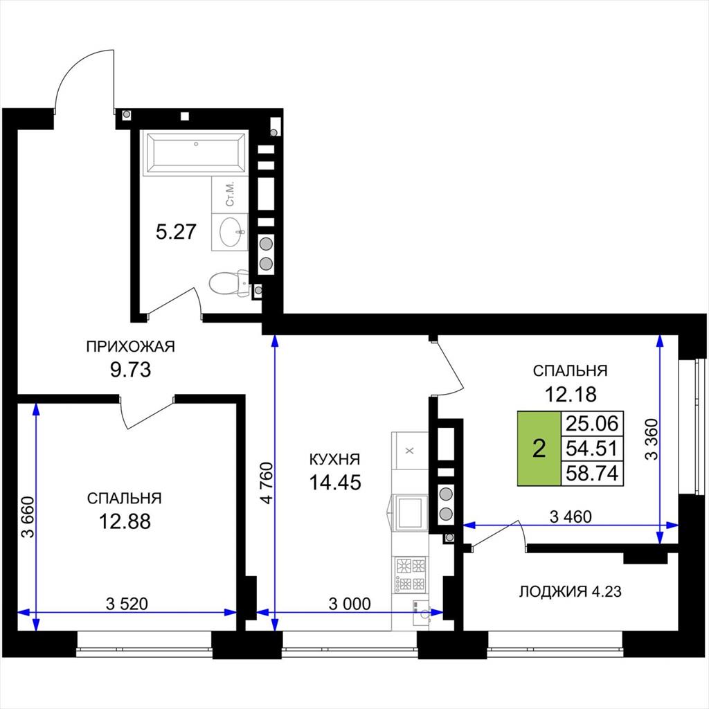 общая 58,74 м2, жилая 25,06 м2, кухни 14,45 м2 |