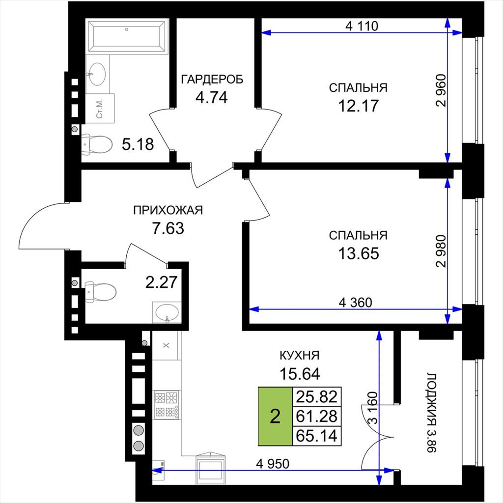 общая 65,14 м2, жилая 25,82 м2, кухни 15,64 м2 |