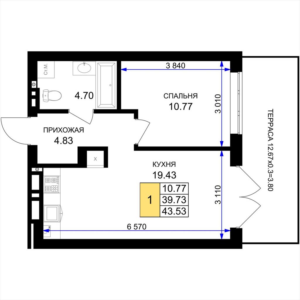 общая 43,53 м2, жилая 10,77 м2, кухни 19,43 м2 |