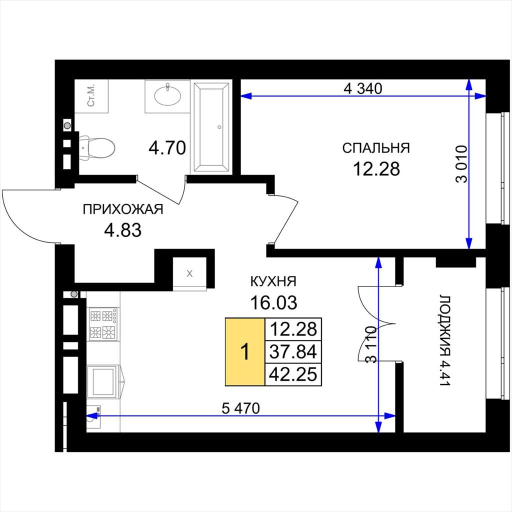 общая 42,25 м2, жилая 12,28 м2, кухни 16,03 м2 |